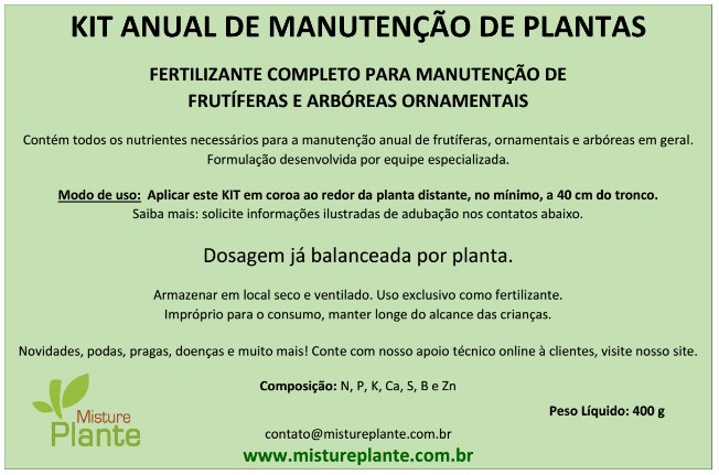 Quer ainda mais facilidade:  adquira nossos COMBOS por planta ou área: receba 2 KITs anuais de fertilizantes (por planta) e receba as informações detalhadas de como nutrir de maneira simples e adequadamente sua planta anualmente, tudo orientado por especialistas e conforme a idade ou fase de seu cultivo. Maiores informações na sessão COMBOS.